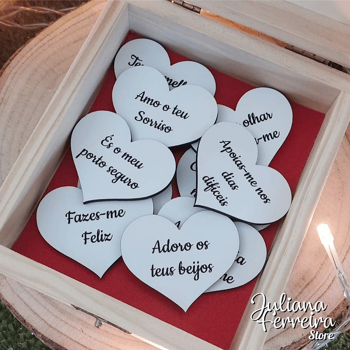 Caixa em madeira com 10 corações gravados com os 10 motivos porque te amo.