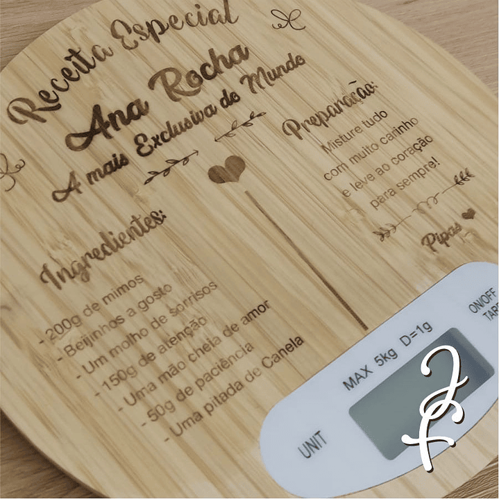 Balança de cozinha, com base de bambu personalizada com gravação a laser de receita com nomes e dedicatória.