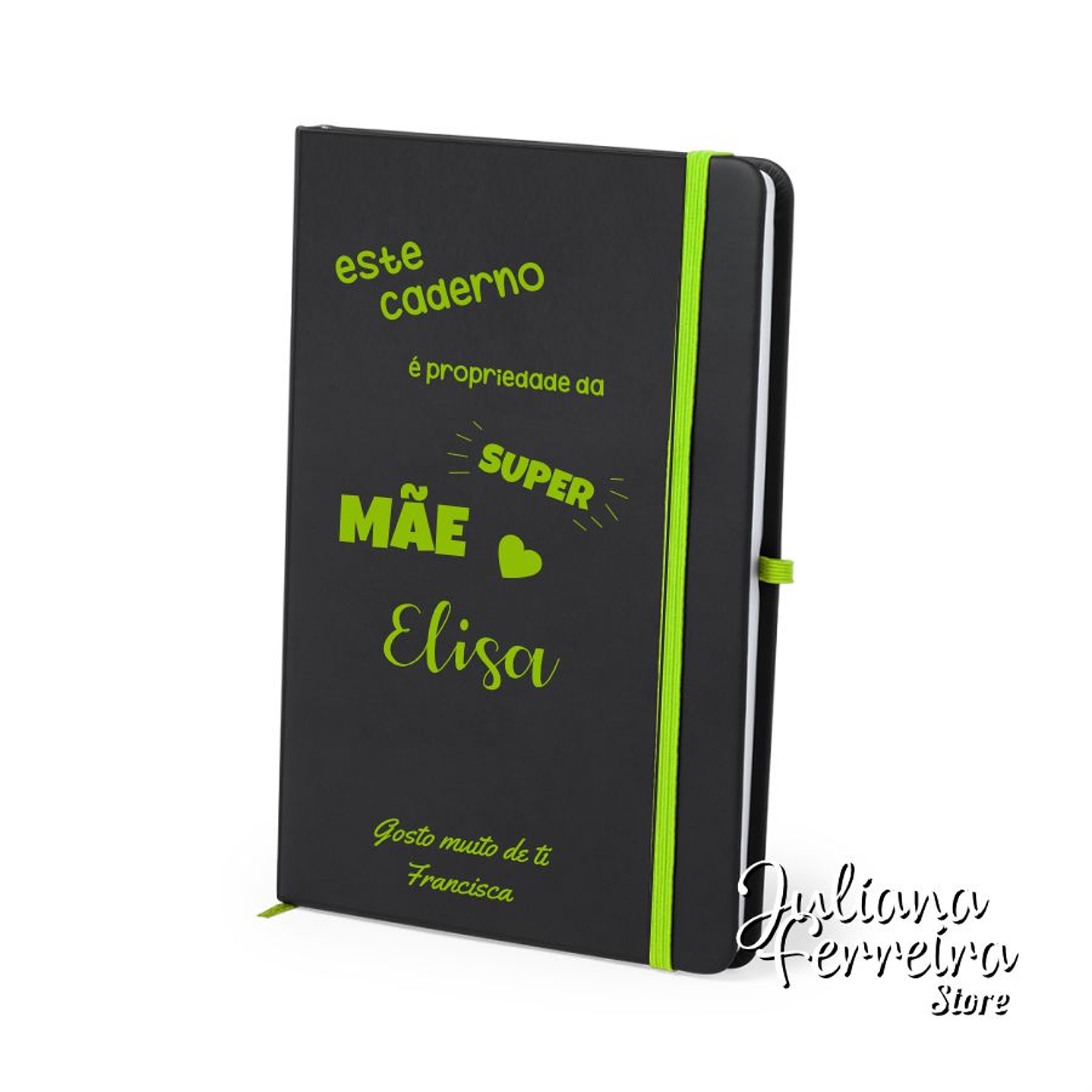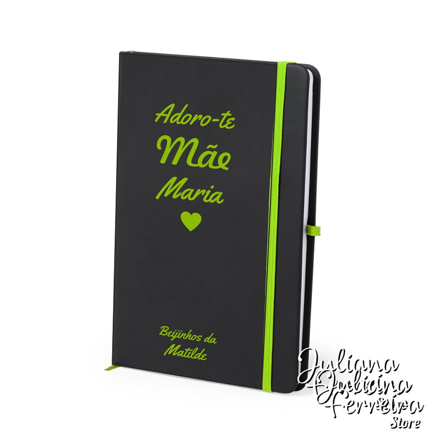 Bloco de notas preto tamanho A5 com gravação a verde.