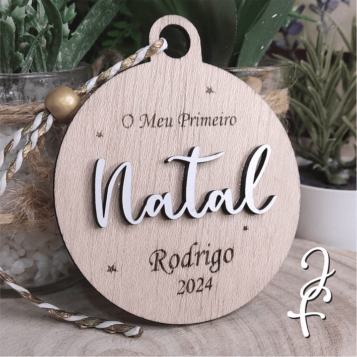 Bola primeiro natal, personalizada com nome e ano para decorar pinheirinho.