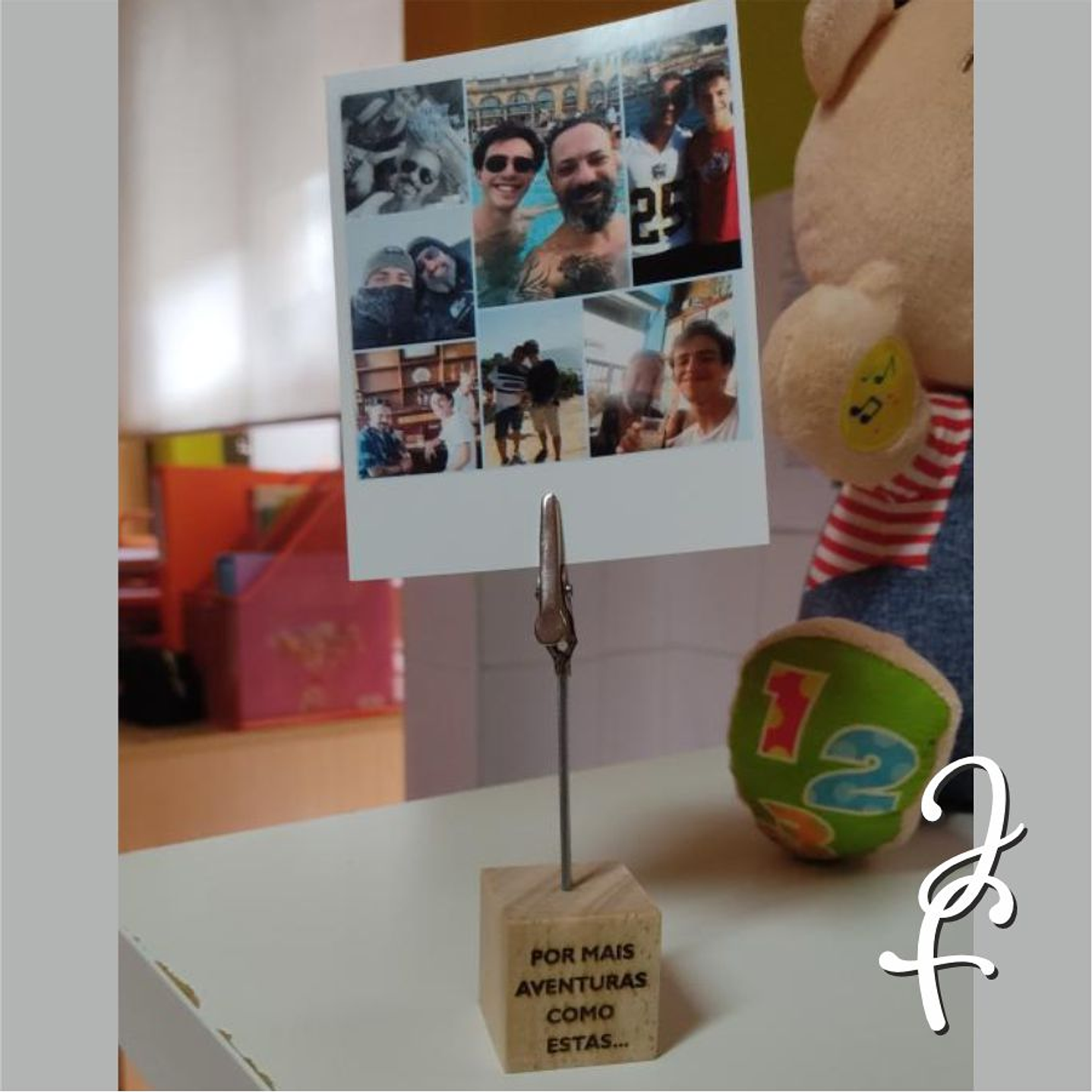 Clipe em metal com base em madeira e fotografia 10x8cm.