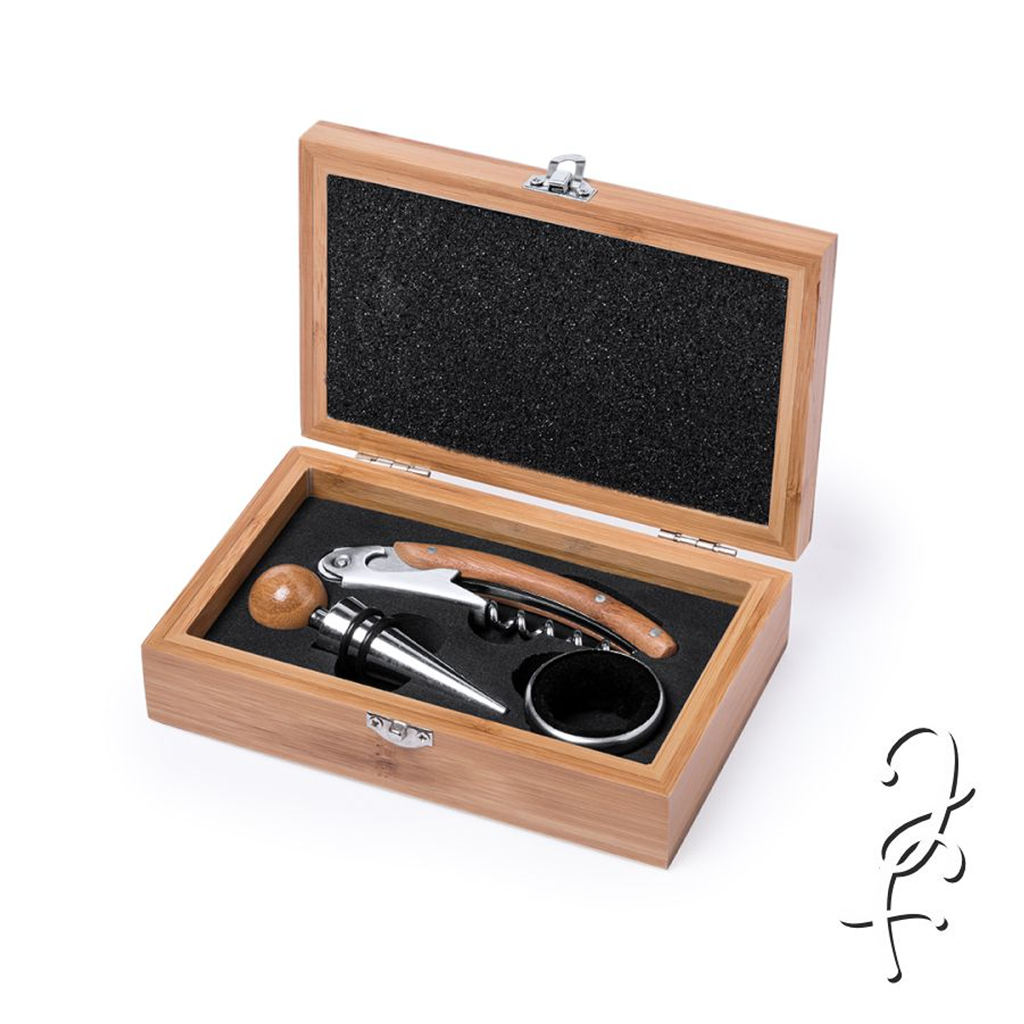 Conjunto de vinhos em madeira de bambu. Acessórios de aço inoxidável. Inclui saca-rolhas, dispensador e gotejador. Apresentado em caixa individual de madeira de bambu, com interior recortado.