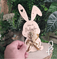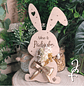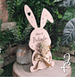 Coelho em madeira gravado e decorado com flores e fita dourada.
