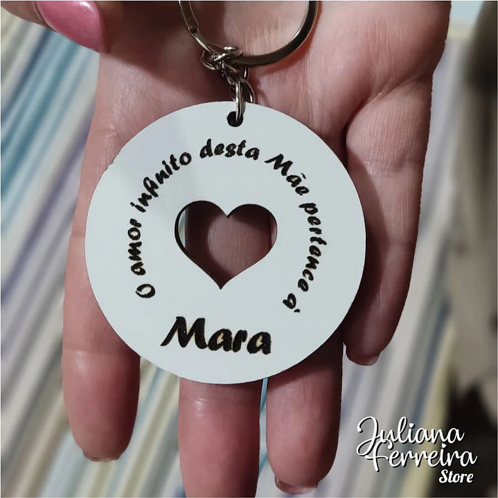 Personalized double-sided keychain for Mother's Day, round with a cut-out heart.