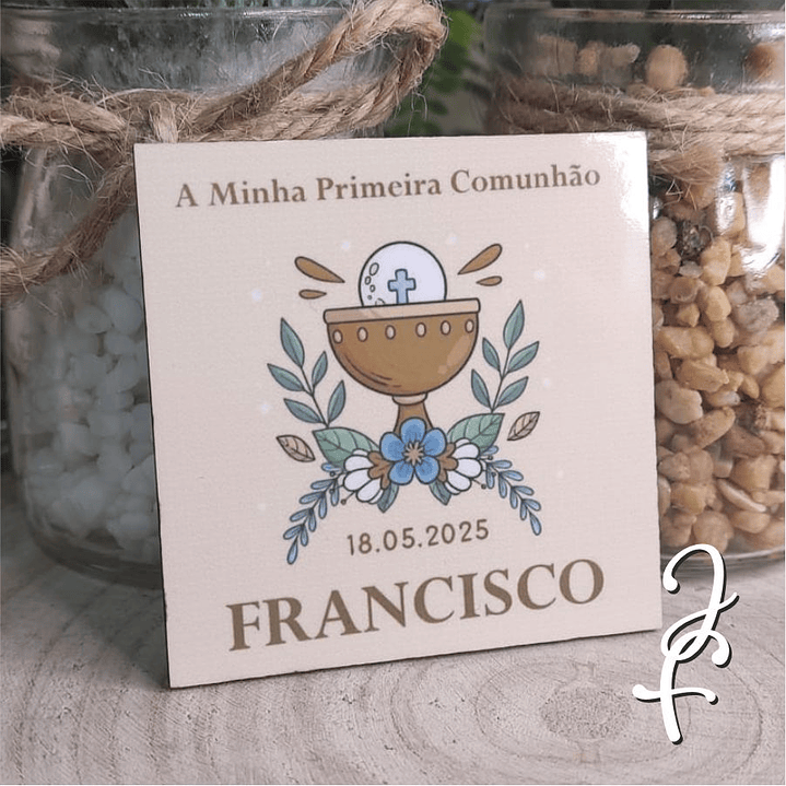 Lembrança de Comunhão com íman, personalizada a cores com cálice e hóstia.
